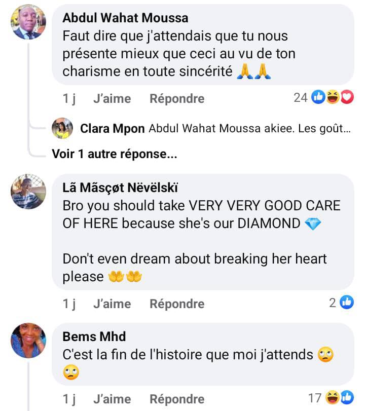 Le lundi 18 mars 2024, l’ancienne protégée de Mr Léo publie sur les réseaux sociaux des images un tantinet coquines d’elle en compagnie d’un homme jusqu’ici inconnu du public camerounais. Sur les 714 commentaires qu’a généré la publication sur Facebook aimée plus de 14.000 fois, les internautes à la grande majorité ont directement conclu qu’il s’agirait du »pain » (argot camerounais qui signifie petit ami) de la star : » Beau couple », » c’est la fin de l’histoire que moi j’attends », »faut dire que j’attendais que tu nous présentes mieux », »amour sur nous mainon », »le beau des beaux », »l’amour », sont là quelques commentaires taquins que l’on peut lire sous la publication.
