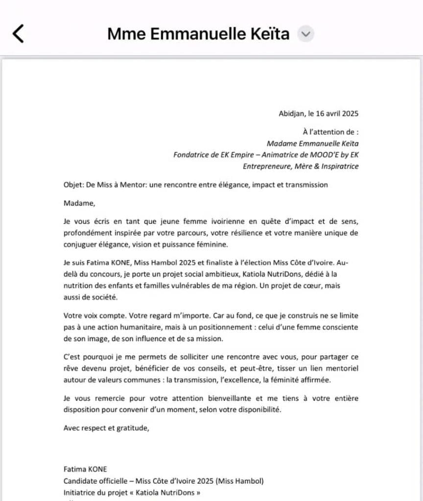 L’animatrice et influenceuse de mode ivoirienne Emmanuelle Keïta partage une réflexion émouvante. Initialement sceptique, elle raconte comment Fatima l’avait approché pour un mentorat, sans suite. Mais les amies de la Miss, par leur soutien indéfectible, l’ont marquée. « Elle est aimée, portée par une communauté », écrit-elle. Keïta voit dans ce sacre une « justesse invisible », un mélange de choix populaire et de destin. « Ce n’est plus une compétition, c’est une grâce », conclut-elle, félicitant Fatima pour son courage.