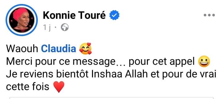 Cependant, si elle annonce pour bientôt son retour à l’écran, Konnie précise que ce ne sera pas là où on l’attend : « Je ne suis plus la présentatrice du Life Weekend certes, mais je travaille toujours à Life TV, la fidélité étant l’une de mes vertus de prédilection. Je vous donne RDV très très bientôt Inshaa Allah sur les antennes de la télé sans filtre« .