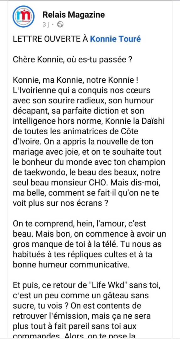 Cette réaction intervient après la publication d’une lettre ouverte dans laquelle l’ivoirienne Claudia Debo de » Relais magazine » demande à Konnie de revenir au devant de la scène : « Chère Konnie, où es-tu passée ? Sérieusement, on t’attend avec impatience sur nos écrans. On a besoin de tes fous rires, de tes pas de danse et de tes conseils avisés. Alors, reviens vite nous voir. » Une doléance faite apres l’annonce de la reprise le 26 octobre prochain et ce après plusieurs mois de pause, de l’émission » Life Weekend« , autrefois présentée par Konnie Touré.