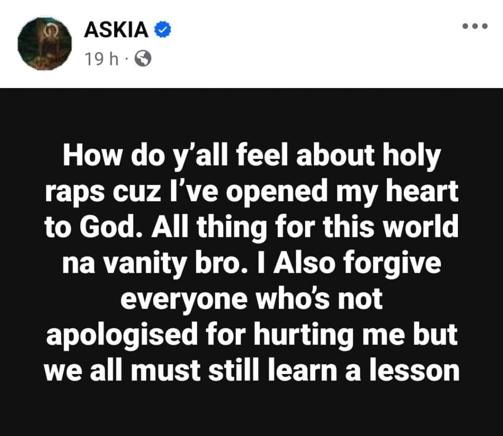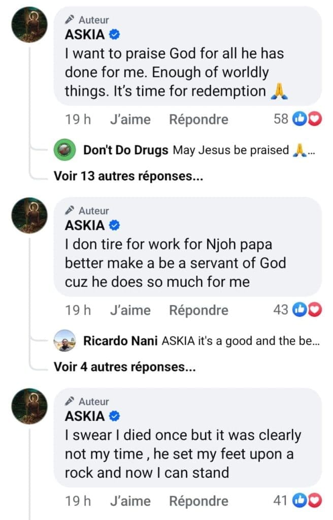 La rappeuse camerounaise Askia annonce qu’elle ne chantera plus pour les gens de ce monde désormais mais pour Dieu. Dans une publication sur ses pages sociales ce mardi 04 juin 2024, Askia a déclaré que la musique mondaine et le bling-bling de la célébrité ne lui rapportaient rien. Un sacré revirement après plus de 10 ans de carrière qui raisonne comme un tonnerre dans le rap camer.