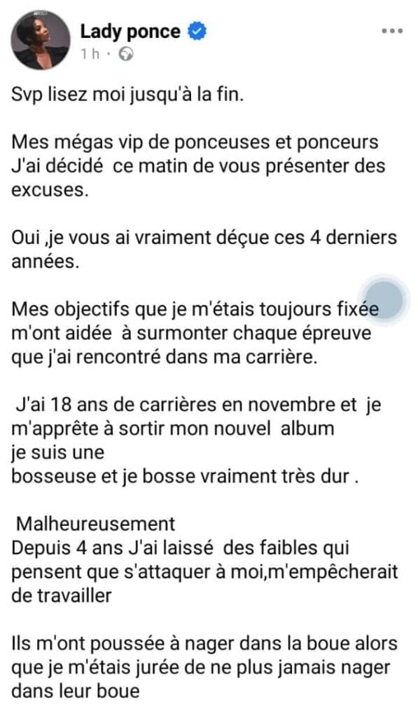 Tout d’abord, elle s’est excusée auprès de ses fans qu’elle surnomme ‘’Ponceurs et Ponceuses’’, pour avoir fait preuve de faiblesse en se laissant ‘’entrainée dans la boue’’ concoctée par ses ceux qui la persécutent depuis de longues années.