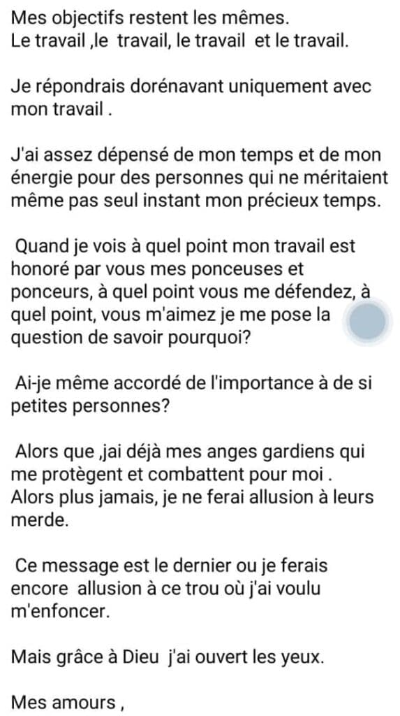 La diva du Bikutsi siffle ainsi la fin de ce qu’on pourrait qualifier de récréation dans sa carrière artistique. Elle brillera désormais uniquement par son travail, celui qui l’a propulsé au sommet de son art. « Je répondrais dorénavant uniquement avec mon travail. J’ai assez dépensé de mon temps et de mon énergie pour des personnes qui ne méritaient même pas seul instant mon précieux temps« , a elle écrit.