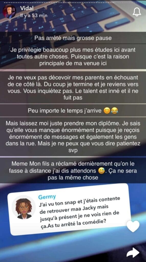 « Je n’ai pas arrêté la comédie mais j’ai fait une grande pause. Je privilégie beaucoup plus mes études, puisque c’est la raison principale de ma venue ici. Je reviendrai peu importe le temps que ça prendra. Laissez-moi juste prendre mon diplôme » implore le web comédien qui déclare être conscient du manque qu’il a créé dans le cœur de ses fans qui l’interpellent, même dans la rue.