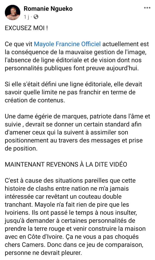 Le 14 janvier 2024, Mayole Francine une influenceuse camerounaise publie sur ses plateformes digitales une vidéo montrant les rues de Cocody à Abidjan et critique d’un air hilarant les espaces poussiéreux. Si la vidéo semble simplement faire partie d’une plaisanterie entre camerounais et ivoiriens, certains la prennent pour comptant. Aza Andrea, Le Général Valsero, Wilfried Ekanga , Fredy Yazele , Florent N’guessan et autres, jugent la sortie maladroite et dénigrante.