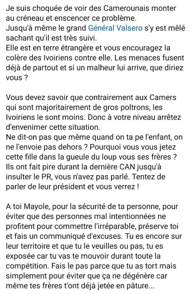 Une polémique qui n’est pas du goût de tout le monde. D’autres n’y voient qu’une plaisanterie , qu’un jeu de plus entre les deux pays qui se titillent depuis longtemps sur les réseaux sociaux. L’influenceuse camerounaise bénéficie alors du soutien de : Fidjil, Tim Storm, Apoutchou National , Valdone le Médiateur, Nikechué et autres. Pour ces derniers les ivoiriens ont fait pire lors de la dernière CAN au Cameroun et donc , n’ont pas le droit de se plaindre.