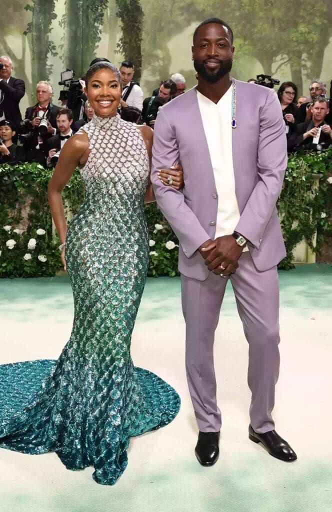 Dans un look complémentaire cool mais subtil, Wade son époux et joueur de NBA à la retraite, portait un costume Versace lilas avec un collier sur le revers gauche, un haut blanc et des chaussures noires.