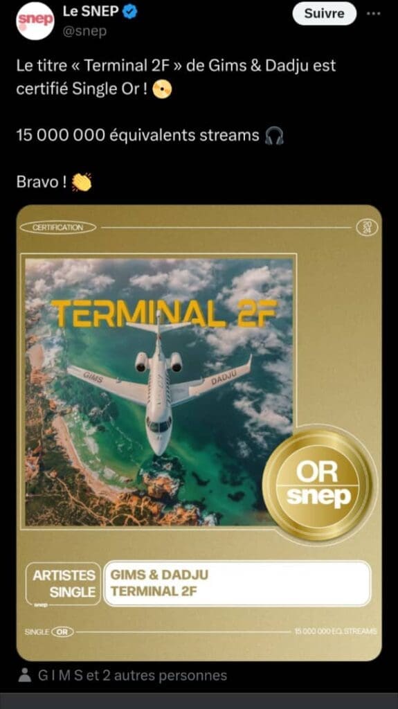 Le 28 octobre 2024, le Syndicat National de l’Édition Phonographique (SNEP) a confirmé la certification Single d’or du morceau « Terminal 2F » de Gims et Dadju. Sortie en août dernier, cette collaboration entre les deux artistes a rapidement séduit les auditeurs, totalisant plus de 15 millions de streams en l’espace de deux mois. Ce chiffre, officiel selon les données du SNEP, reflète la popularité de ce morceau sur les principales plateformes d’écoute.