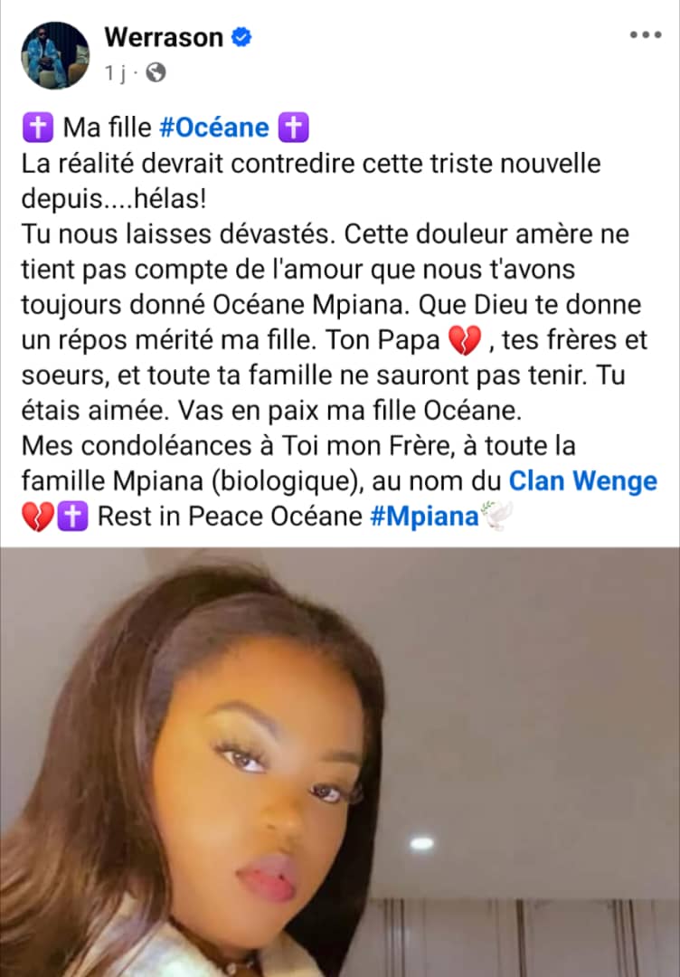 Parmi les nombreux témoignages, celui de Werrason, ancien compagnon de route de JB Mpiana dans le mythique groupe Wenge Musica BCBG, a particulièrement touché les fans. Dans un message empreint de tristesse, il a exprimé sa douleur en ces termes : « Ma fille Océane, la réalité devrait contredire cette triste nouvelle depuis… hélas ! Tu nous laisses dévastés. Cette douleur amère ne tient pas compte de l’amour que nous t’avons toujours donné. Que Dieu te donne un repos mérité ma fille. Ton papa, tes frères et sœurs, et toute ta famille ne sauront pas tenir. Tu étais aimée. Vas en paix ma fille Océane. Mes condoléances à toi mon frère, à toute la famille Mpiana, au nom du Clan Wenge. Rest in Peace Océane Mpiana ».