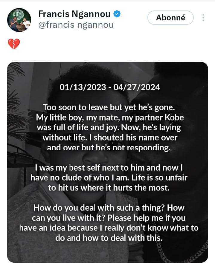 C’est à travers un message empreint d’émotion que Francis Ngannou a informé le public dimanche 28 avril 2024 sur le décès de Kobe, son dernier fils: « Trop tôt pour partir et pourtant il s’en est allé. Mon petit garçon, mon compagnon, mon partenaire Kobe était plein de vie et de joie. Maintenant, il est couché sans vie. J’ai crié son nom encore et encore mais il ne répond pas… Pourquoi la vie est-elle si injuste et impitoyable ? Pourquoi la vie prend-elle toujours ce que nous n’avons pas ? Je suis putain de fatigué ».
