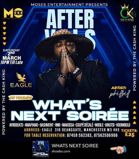 Phillbill est actuellement en Angleterre pour une série d’événements majeurs. Le 02 mars 2024, il enflammera la « What’s Next Soirée » à Manchester, pôle culturel par excellence du Royaume-Uni. C’est une occasion exceptionnelle pour son public anglais de danser avec sa star, reprenant des chorégraphies de ses titres emblématiques tels que Shabasiko, Bikossa, La Clé, et Malova.