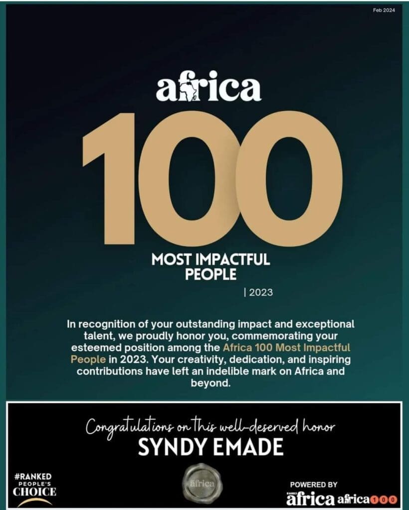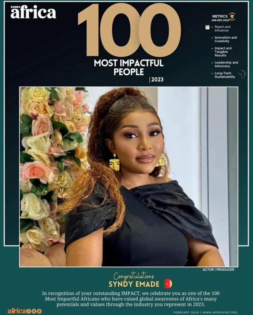Ranks Africa est un magazine international qui valorise l’excellence africaine. Cette 4e édition a vu le sacre de la camerounaise Sindy Emade nommée dans le top 100 des personnes qui influencent de par leur engagement et leurs œuvres le continent africain : » nous honorons et célébrons fièrement Syndy Emade, dont les contributions percutantes ont laissé une marque indélébile sur l’Afrique et au-delà » a déclaré le comité de direction sur leurs plateformes digitales.