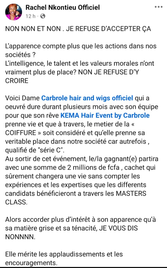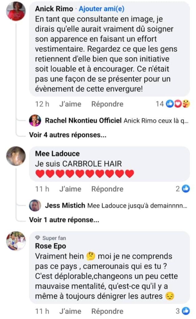 Au lendemain du lancement du Kema Hair Event, la promotrice Carbrol Ebongue a été vivement critiquée sur son apparence par certains internautes. En réaction, l’actrice Rachel Nkontieu et l’humoriste Moustik Le Karismatik lui ont publiquement apporté leur soutien.