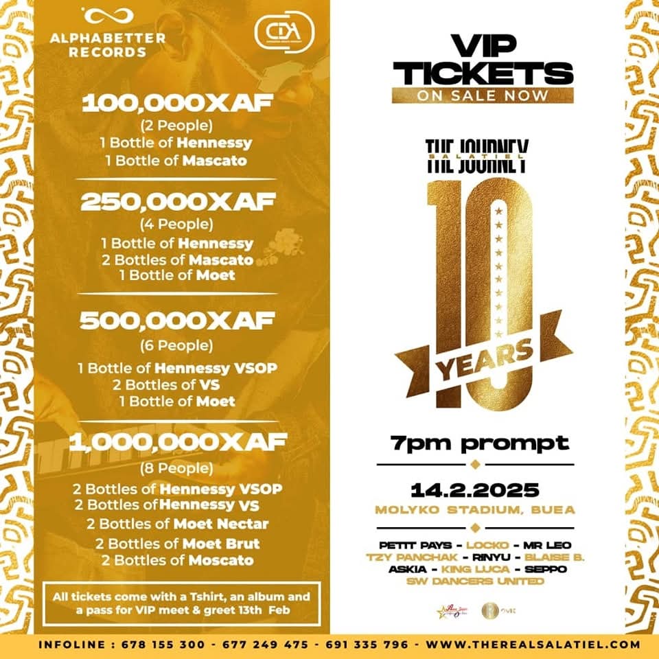 Salatiel : On a essayé de mettre le tickets au plus bas prix car dix ans de carrière c’est aussi les dix ans de mes fans. Les tickets vont de 1.000 Fcfa à 1.000.000 Fcfa. On est sensé faire 15000 à 20000 places au stade de Molyko. Je voudrais que tout le monde soit capable d’assister à ce concert.