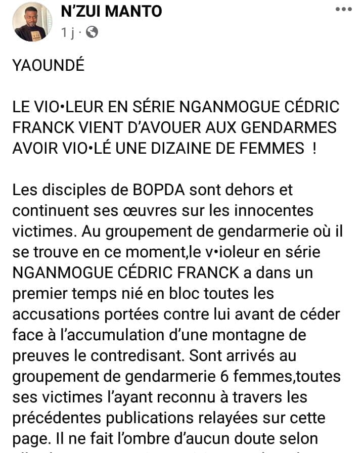 Un nouveau scandale sexuel secoue le Cameroun depuis quelques jours. Un homme âgé de 26 ans, camerounais selon les données de sa carte d’identité, du nom de Nganmogue Cédric Franck et inconnu des médias jusque là est accusé par plusieurs jeunes femmes de viol, d’escroquerie et violences sexuelles de tout genre. Une affaire qui rappelle celle d’un autre présumé prédateur sexuel du nom de Hervé Bopda, actuellement en détention à la prison de New-Bell à Douala et qui avait défrayé la chronique.