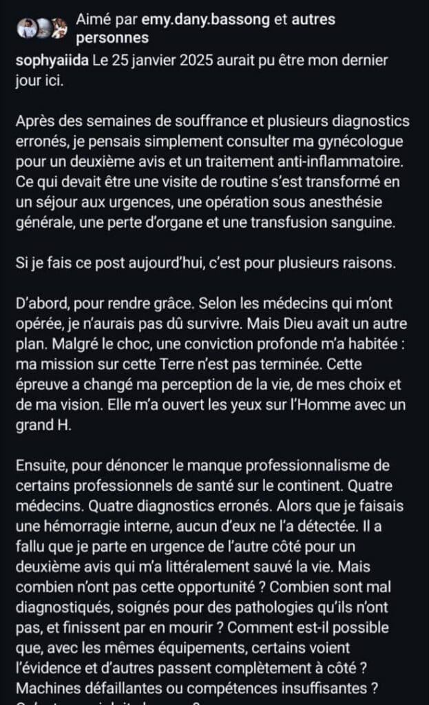 Au-delà de son expérience personnelle, Sophy Aiida a interpellé sur les défaillances du système médical. Elle s’est interrogée sur les raisons qui ont conduit quatre médecins à ne pas détecter son hémorragie, alors que d’autres ont su réagir à temps : « Combien sont mal diagnostiqués, soignés pour des pathologies qu’ils n’ont pas, et finissent par en mourir ? », a-t-elle écrit.