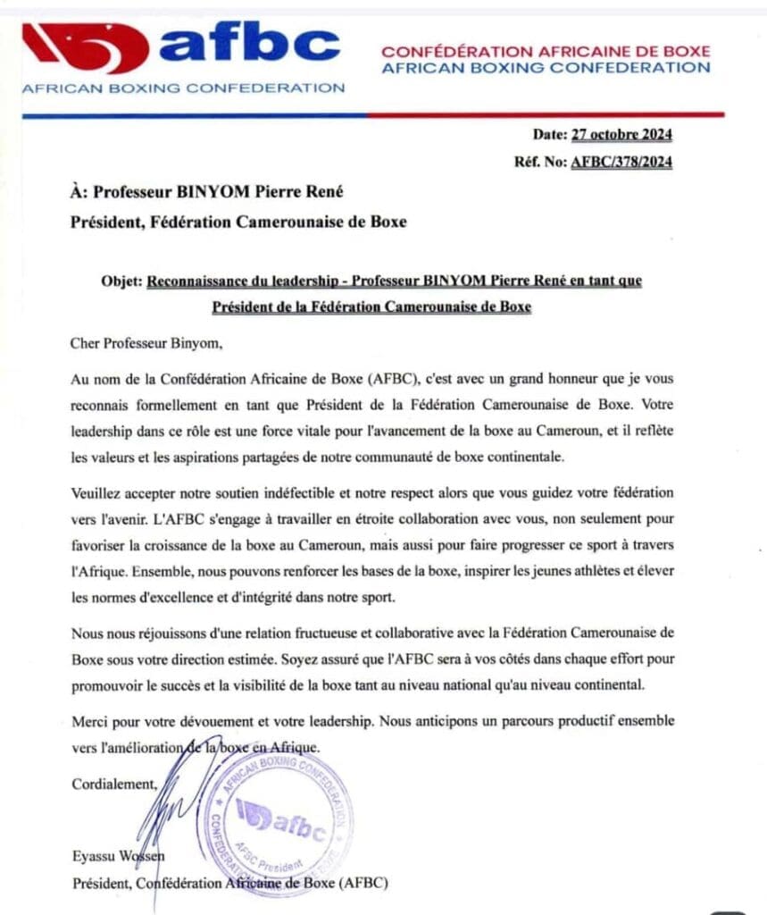 C’est par le biais d’une correspondance que l’AFBC ( African Boxing Confédération) a fait savoir qu’elle est “heureuse” de travailler avec Pierre Binyom comme président de la Fédération camerounaise de boxe. Cette correspondance précise également que l’intéressé aura droit au soutien de la Confédération dans sa périlleuse mission de restructuration d’une discipline engluée depuis de nombreux mois dans des querelles intestines.