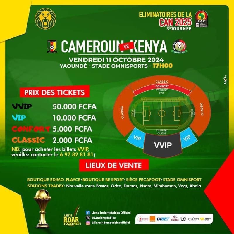 Après une réunion dédiée à la présentation du nouveau staff technique en matinée au Minsep sous la houlette du président de la Fecafoot, la première Vice-présidente de la fédération enchaîne les réunions préparatoires et la coordination des sélections nationales chapeauté désormais par Timothée Atouba. Tout le monde se met en branle pour offrir aux officiels du match et au Kenyans un bel accueil dans les prochaines heures. Par ailleurs , les tickets d’entrées au stade, qui vont de 2000 à 50.000 FCFA, se vendent déjà au siège de la fédé, mais également dans certains coins stratégiques de la capitale Yaoundé.
