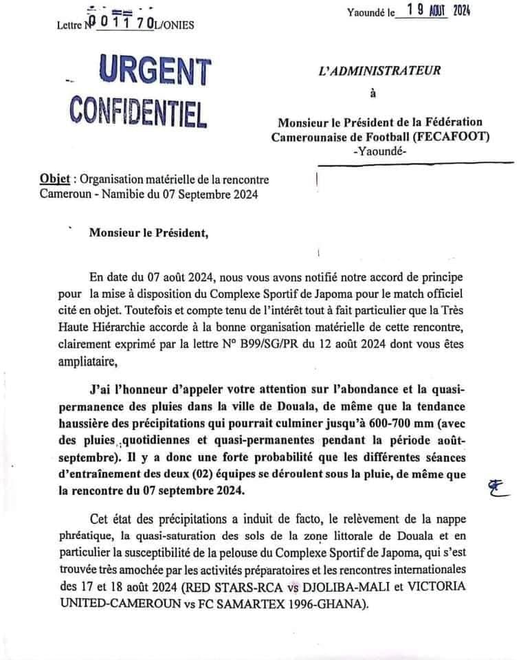 Bien malin celui qui peut déterminer avec certitude le lieu où se tiendra la rencontre Cameroun – Namibie du 7 septembre prochain. En effet, la Fecafoot, qui avait préalablement obtenu la tenue du match au stade de Japoma auprès de L’Onies vient d’être rattrapé par une correspondance de la même institution qui lui suggère de déplacer cette affiche pour un autre lieu du pays.