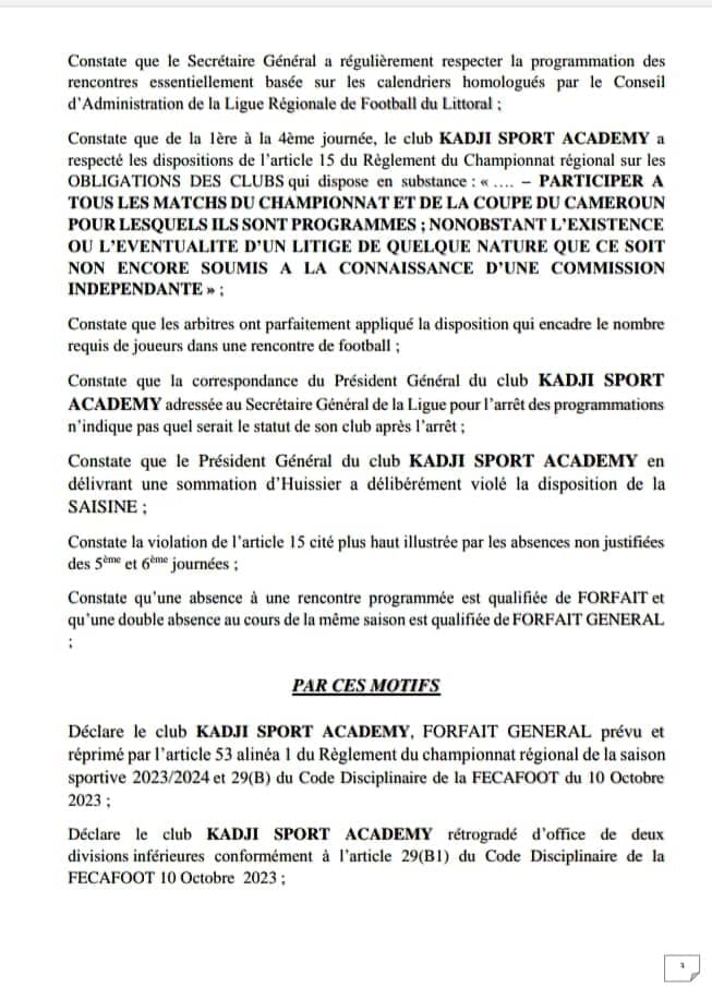 Au bout de deux absences, le club a été déclaré forfait général comme le prévoit l’article 54 alinéa 1 du règlement du championnat régional de la saison en cours. Ce qui explique les deux sanctions, notamment celle qui rétrograde la Kadji Sport Academy de deux divisions inférieures et celle qui prive son président de tout activité liée au football durant les 5 prochaines années.