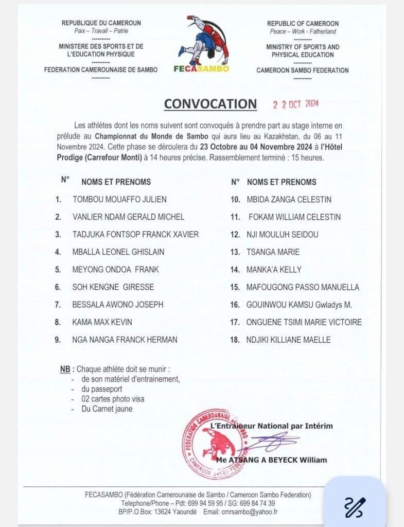Pour offrir plus de chances à ses athlètes lors des prochains championnats du monde prévus au Kazakhstan du 06 au 11 novembre prochain, la fédération camerounaise de Sambo a publié une liste de 18 samboïstes appelés à entrer en stage à Yaoundé qui démarre ce mercredi 23 octobre jusqu’au 04 novembre 2024 . Ledit stage, dont l’objectif sera de tirer le maximum de stagiaires en Sambo sportif mais également en Sambo Combat sera coordonné par l’entraîneur national par intérim, maitre William Beyeck.