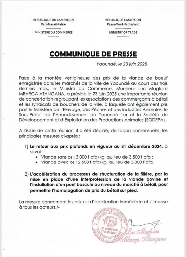 Le Ministère du Commerce (Mincommerce), lutte activement contre la vie chère au Cameroun en créant diverses stratégies, notamment des campagnes de ventes promotionnelles et des mesures contre la spéculation, pour stabiliser le coût des produits de première nécessité. Il a annoncé à travers un communiqué de Presse, une baisse du prix du kilo de la viande de bœuf sur l’etal soit 3000 Fcfa le kg sans os et 2500 Fcfa le kg avec os. Une sortie qui n’est pas passée inaperçue aux yeux de l’actrice et productrice camerounaise, Flavienne Tchatat, qui n’a pas manqué de partager le communiqué avec sa communauté afin que nul n’en ignore.