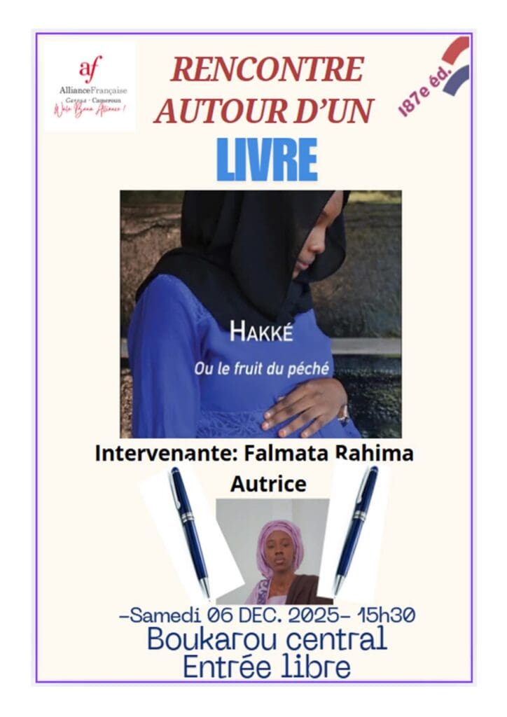 Le samedi 6 décembre à 15h30, l’Alliance Française de Garoua organise une rencontre autour du livre « Hakké ou le fruit du péché » de l’autrice Falmata Rahima.
