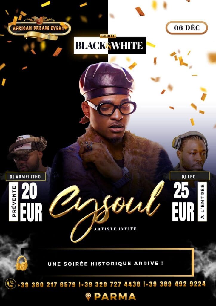 Le 6 décembre, la ville de Parma en Italie vibrera aux sons du Cameroun avec une Soirée Black & White accueillant l’artiste Cysoul comme invité spécial. À ses côtés : DJ Armelitho et DJ Leo pour une soirée annoncée comme « historique ».